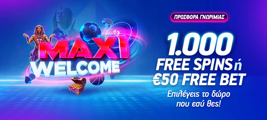 H Sportingbet σου επιφυλάσσει απίθανο καλωσόρισμα, με MAXI έπαθλα: 1.000 Free Spins ή €50 Free Bet για να μπεις στο παιχνίδι.